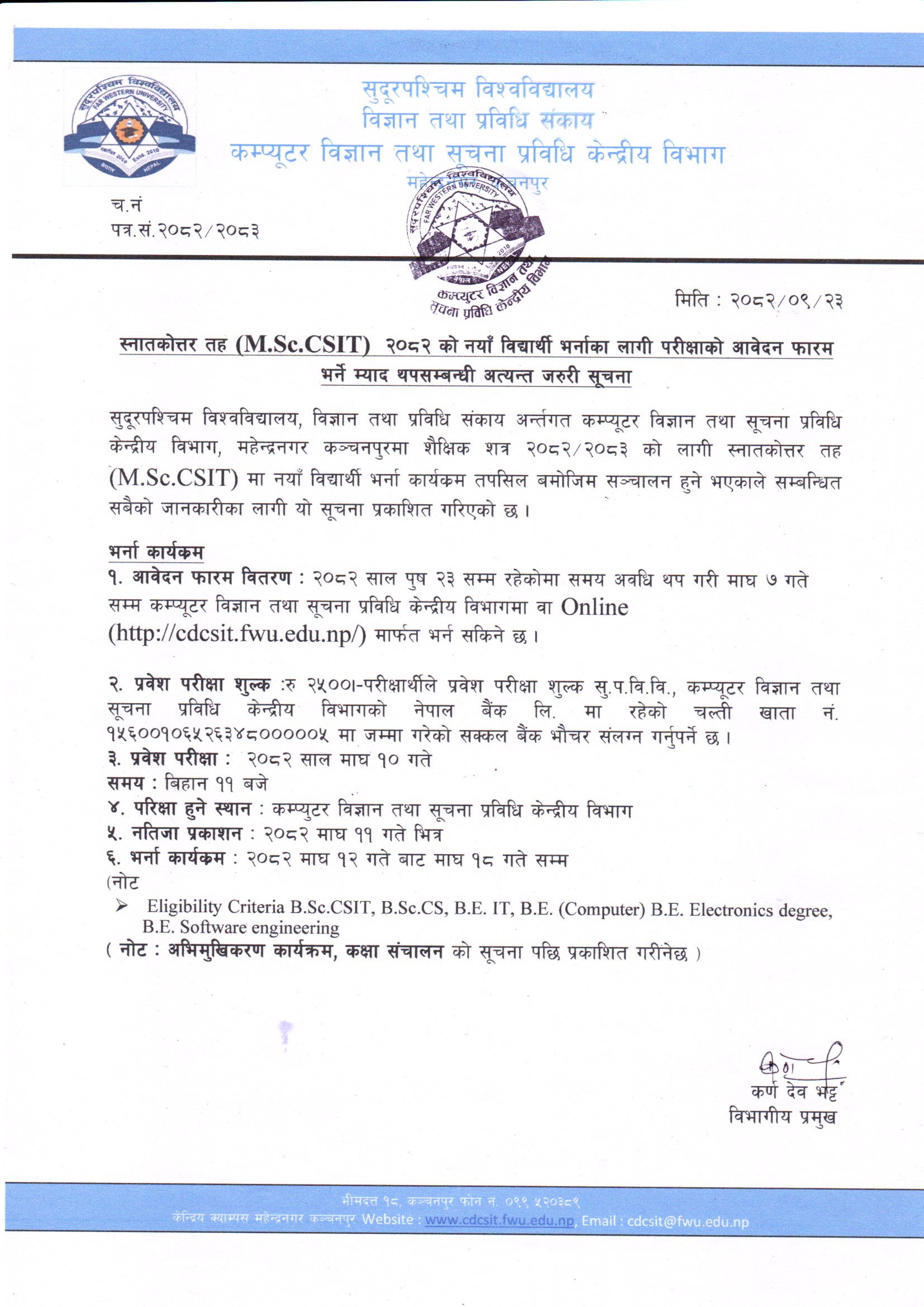 स्नातकोत्तर तह M.Sc.CSIT २०८२ को नयाँ विद्यार्थी भर्नाका लागी परीक्षाको आवेदन फारम भर्ने म्याद थपसम्बन्धी अत्यन्त जरुरी सूचना